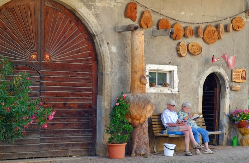 Ale ani cyklisté to v Ráji nemají vždy snadné, i když zrovna zde u situacenafotce vlevo si nejsem jist, jak oznámení v uvozovkách chápat. Pokud je to citát, bylo by vhodné uvést autora. Nebo mají uvozovky naznačit ironii, tedy to, že slovní zákaz není míněn tak úplně vážně, piktogram zákazu vjezdu cyklistů jeale bohužel jednoznačný. kdybych jel přece jen dál, snad bych jako stařík na tříkolce uspěl s výmluvou: to pro mne neplatí, já mám o kolečko víc Nu což, vážné téma. Tak pro odlehčení jednofoto z naší veselé vesnice.což mi něcopřipomíná, jen si teď právě nevzpomenu co...